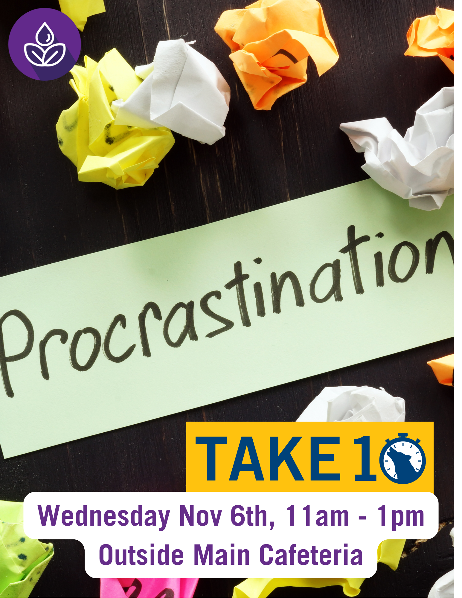 Visit staff from Student Health & Wellness outside the Main Cafeteria on November 6th between 11am and 1pm who'll be sharing some insights to learn more about procrastination and how you can beat it.
