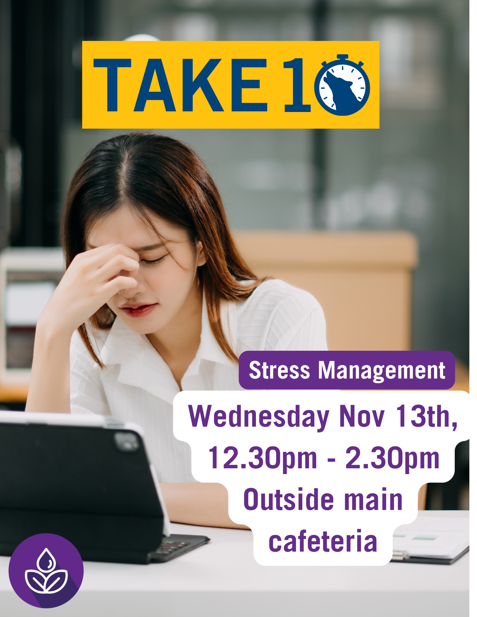 Visit staff from Student Health & Wellness Outside Main Cafeteria on November 13th between 12.30pm and 2.30pm who'll be sharing some tips on stress management.
