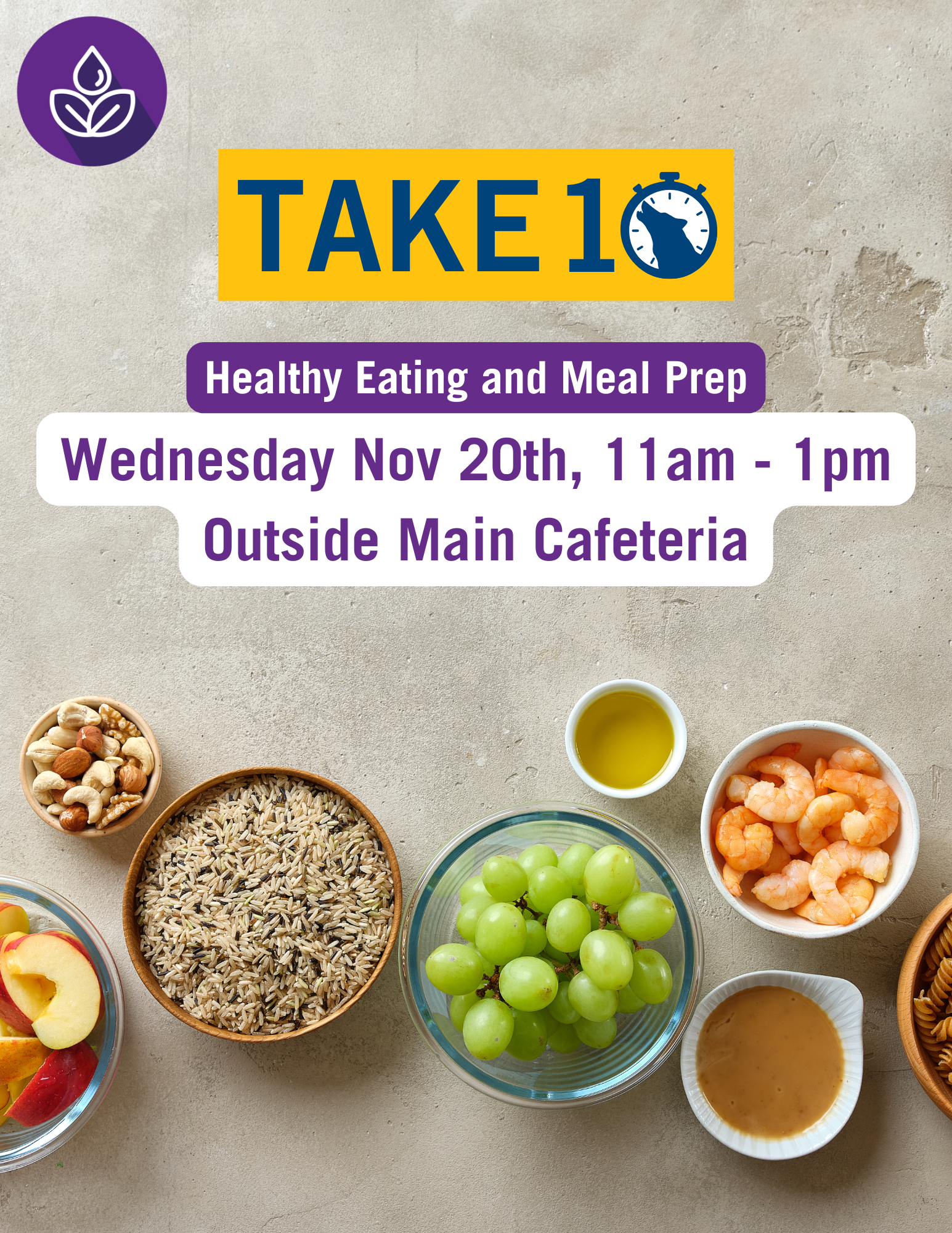 Join staff from Student Health & Wellness outside the Main Cafeteria on November 20th between 11am and 1pm to learn some practical nutrition tips that you can implement this month to help you have more energy and stay healthy as you work towards wrapping up the semester. We’ll be sharing a healthy snack, along with some of our favorite recipes, healthy eating strategies, and tips regarding mindful eating!