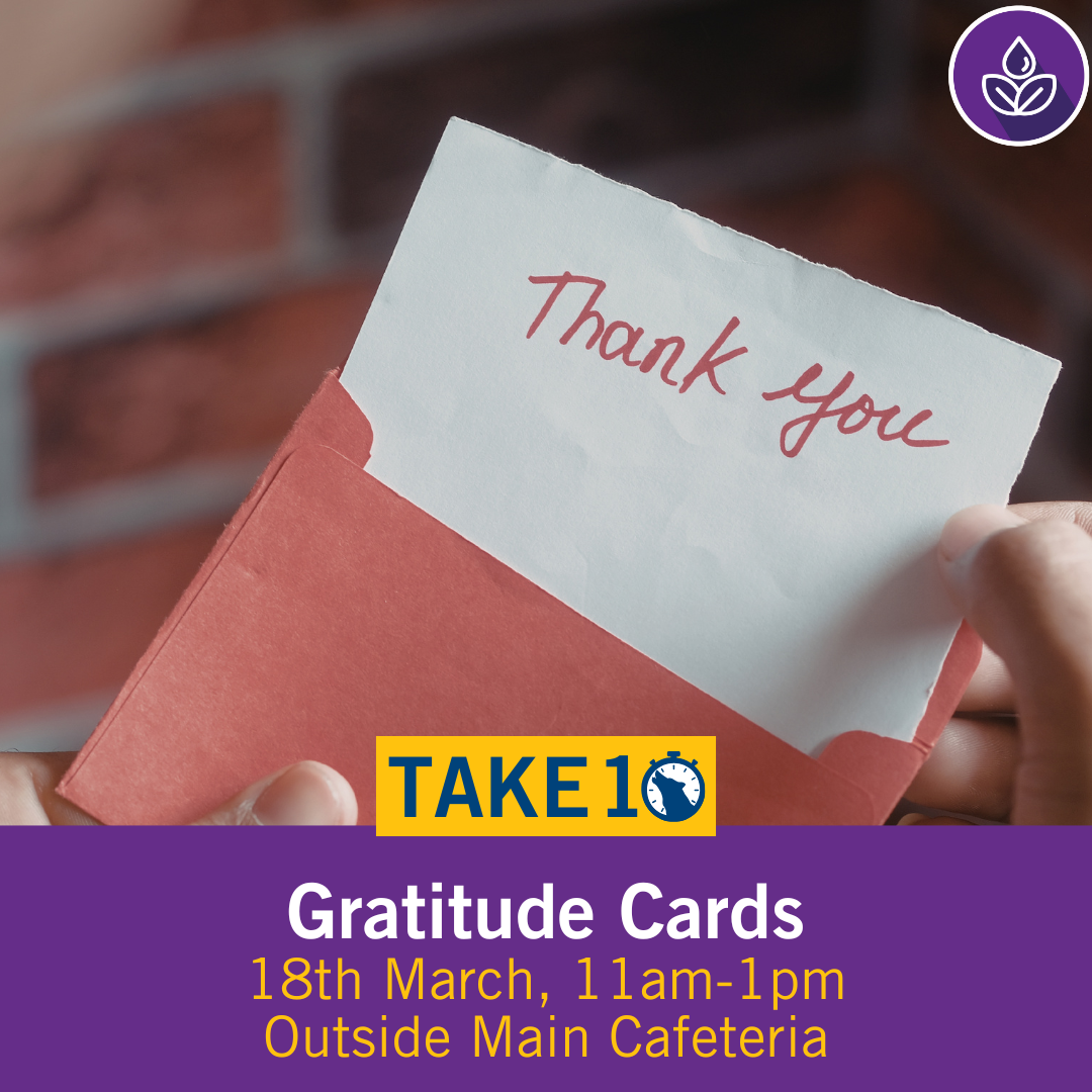 Join staff from Student Health & Wellness outside the Main Cafeteria on March 18th between 11am and 1pm for “Gratitude Cards” as we wrap up the semester!