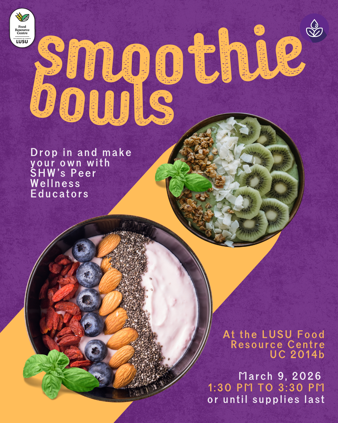 Celebrate Nutrition Month with Student Health and Wellness and the Food Resource Centre at our Smoothie Bowl Bar. Drop in to build your own smoothie bowl and enjoy a free, nourishing snack while connecting with Peer Wellness Educators. Learn simple, budget-friendly tips for meal planning, using affordable ingredients like frozen fruit, and stretching your grocery dollars during the busy final stretch of the semester.