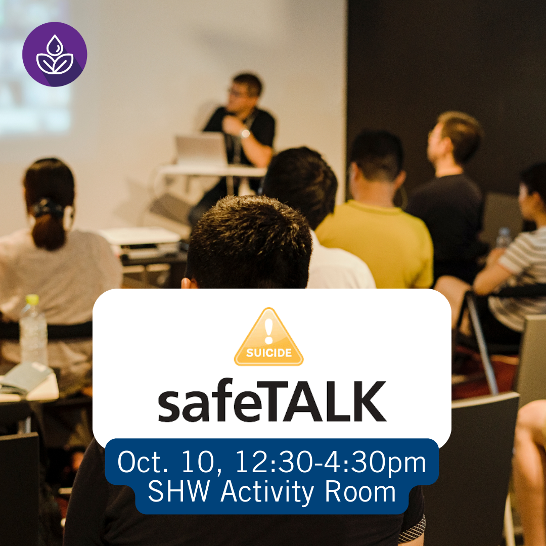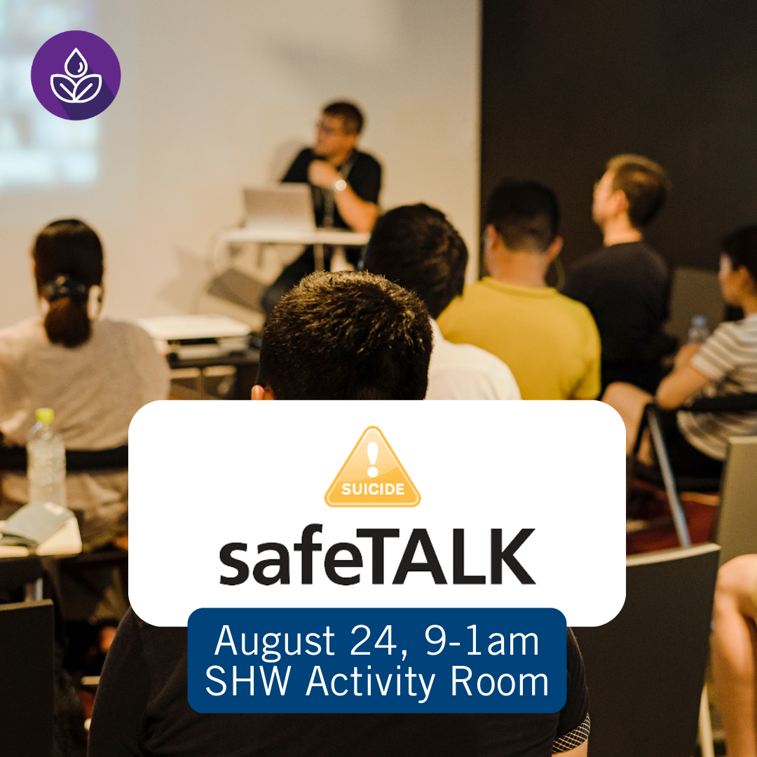safeTALK is a 4-hour, in-person workshop to build skills in suicide prevention. Participants will learn how to recognize and engage with someone thinking about suicide, overcome attitudes that act as barriers to help, talk openly about suicide and connect with intervention resources for further support.