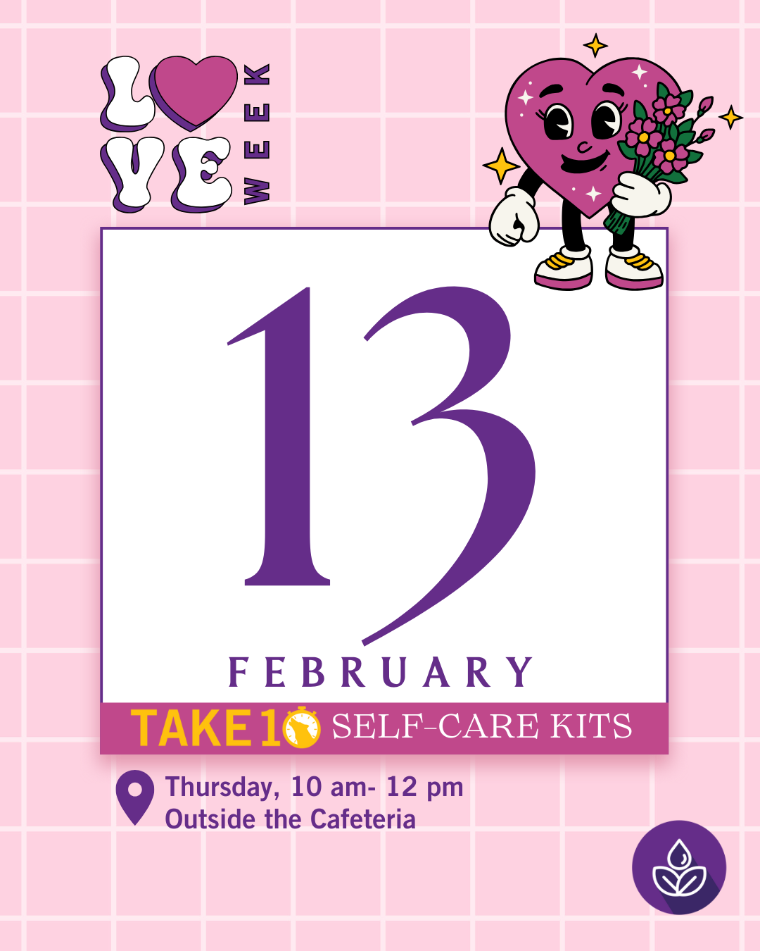 Visit staff from Student Health & Wellness outside the main cafeteria on Fecruary13th between 10am and 12pm who'll be sharing some tips on self-care.