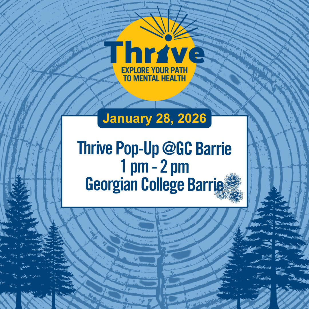 Thrive Week is coming to GC in Barrie! Drop by to build your own Thrive Kit and take what you need to support your wellbeing this semester!