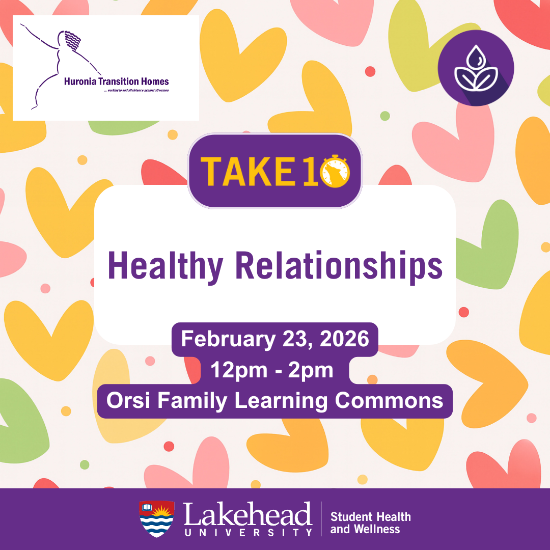 Drop by the Learning Commons to chat with Huronia Transition Homes about consent and healthy relationships.
