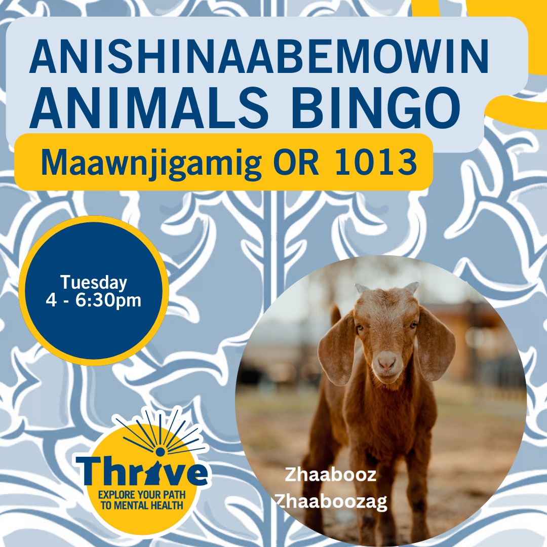 The dabbers are calling! Join Frazer Phillips, Indigenous Cultural Wellness Facilitator, to try your hand at bingo, win some nutritious prizes, and learn the names of animals in Anishinaabemowin!.