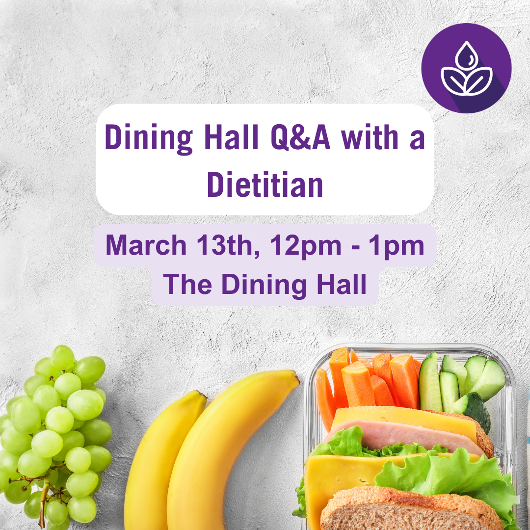 Are you a regular at the caf and curious about how to get the most out of your meals? Join Dietitian Donna from Dana Hospitality for a Lunch & Learn at the dining hall! Donna will walk through the dining hall with the group to discuss the food options, answer questions, and help you build a nutritious meal that meets your preferences. The group will also have an opportunity to sit down with Donna to learn more about healthy eating strategies.