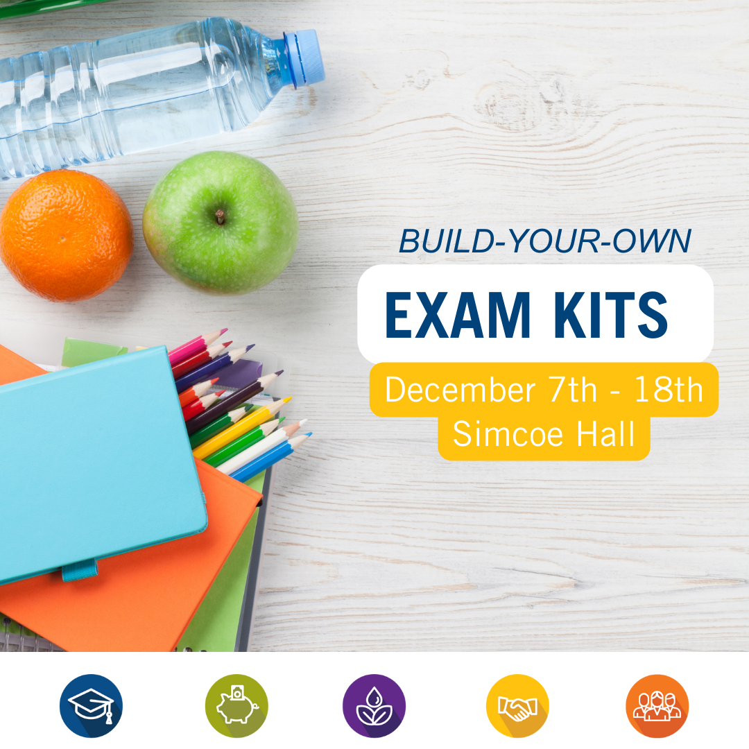 To help get you through exams, the Student Affairs department is offering Build-Your-Own Exam Kits in Simcoe Hall! Stop by any time from December 7th-18th to get what you need to have a healthy and successful exam period. Kit items include: