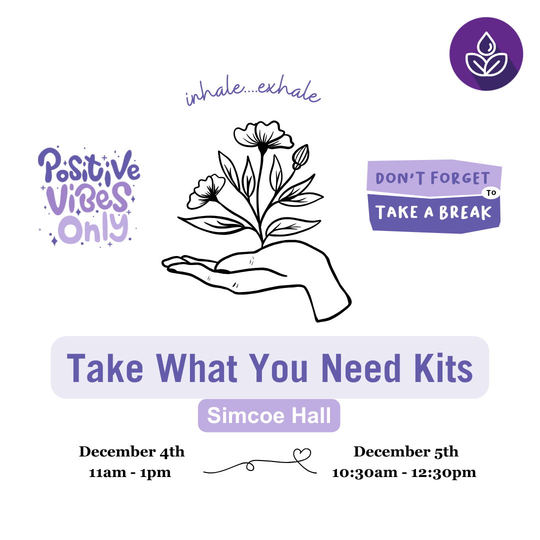 Pick up a "Take What You Need" exam kit from Student Health and Wellness with tips and tools to support you through final exams this semester! Choose the exam kit that suits your needs and feel the benefits of prioritizing your mental well-being!