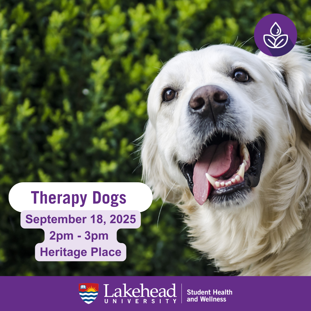 The cutest kind of stress relief is back on campus! Visit the St. John Ambulance Therapy Dogs at Heritage Place from 2pm - 3pm.