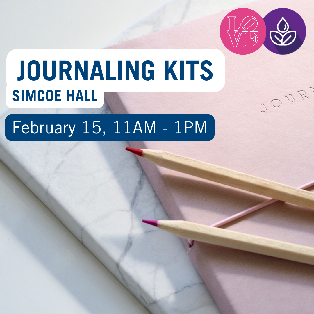 Stop by Simcoe Hall to pick up a journalling kit as part of Student Health and Wellness' Love week. Each kit includes a journal, writing tools and an intro guide to journalling as self-care.