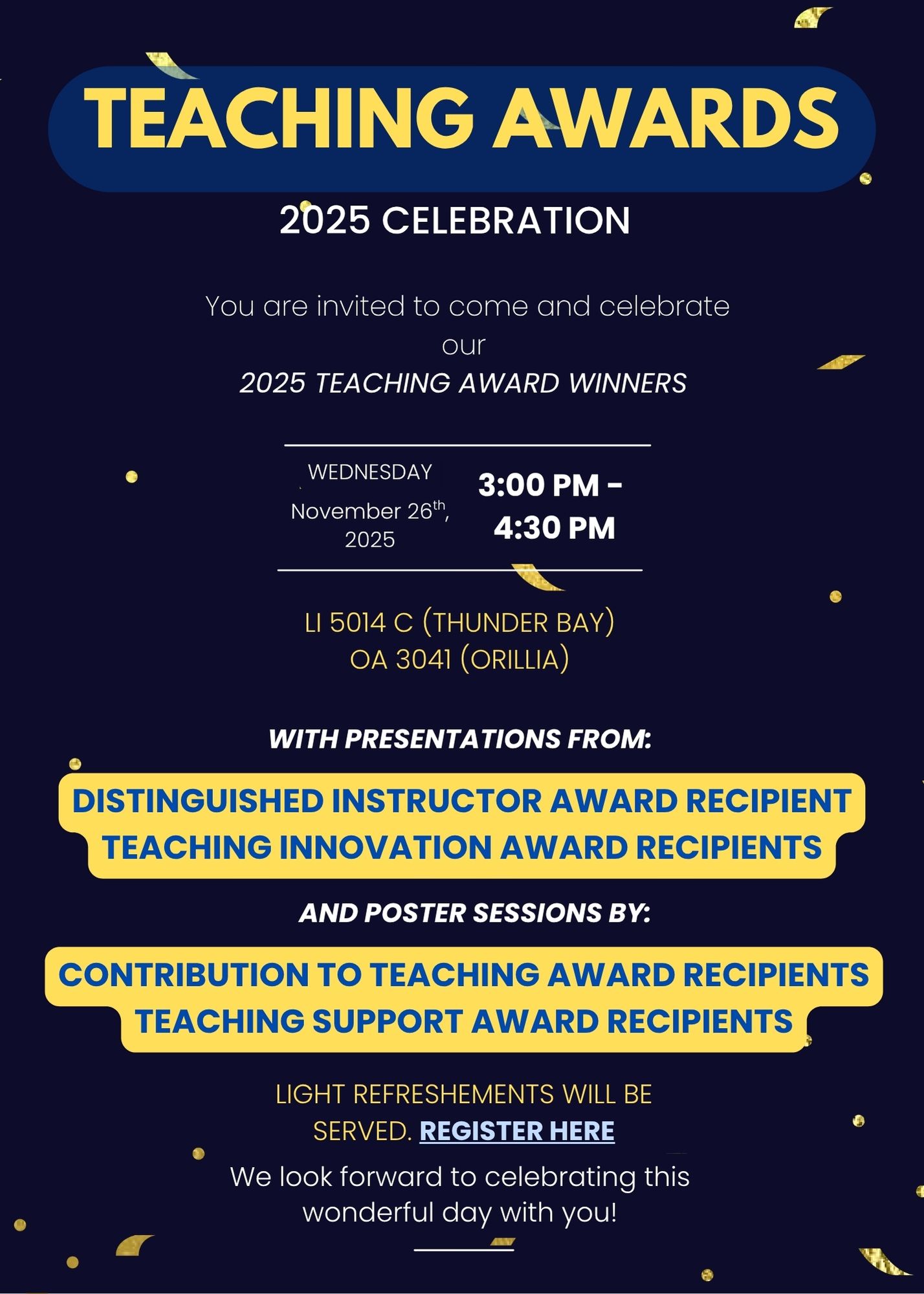 Join us in celebrating excellence in teaching, learning, and educational leadership at this year’s Teaching Awards Reception. This special event recognizes outstanding instructors and teaching support staff who have demonstrated exceptional commitment, innovation, and passion in supporting student success.